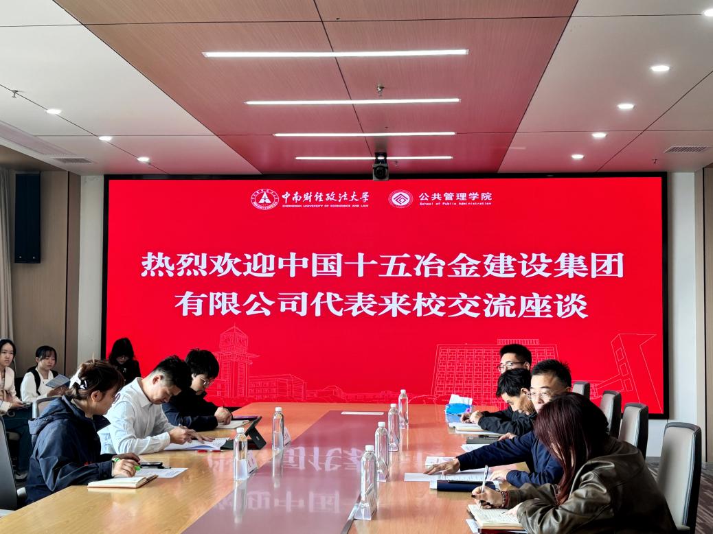 2025年11月5日上午,中国十五冶金建设集团有限公司(以下简称“十五冶”)代表一行应邀访问中南财经政法大学公共管理学院,于南湖校区文瀚楼成功举办校企交流座谈会及专场招聘会。学院党委书记王建荣、党委副书记兼纪委书记刘茂盛等院领导、辅导员代表及2026届硕博毕业生代表共同参会。