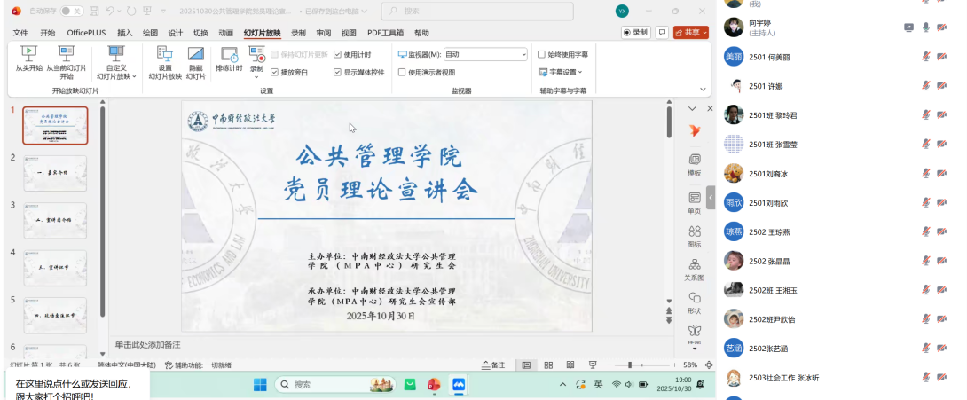 (通讯员 肖丽珍)为强化研究生党员思想政治教育,培养一批具有坚定理想信念、强烈社会责任感的高素质研究生党员队伍,10月30日晚,公共管理学院研究生会宣传部举办了以“学习创新理论,汲取奋进力量”为主题的宣讲活动。本次活动由宣传部成员向宇婷主持,特邀研究生党员理论宣讲团成员万雯、张易菲担任主讲嘉宾,公共管理学院全体研究生通过腾讯会议参与活动。