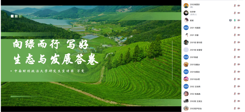 随后,研究生党员理论宣讲团成员万雯以“向绿而行,写好生态与发展答卷”为主题展开宣讲。她首先通过蚂蚁森林等生动案例,引出生态文明建设这一时代课题,系统梳理了“绿水青山就是金山银山”理念的形成与发展历程。接着,她从“工业文明VS生态文明”的对比分析入手,深刻阐释了生态文明建设的必要性和紧迫性,并结合巴东县“硒+农业”、西藏林芝“桃花经济”助力生态富民等典型案例,展示了将生态优势转化为发展优势的创新实践。最后,她通过中国在全球生态环境治理中的贡献案例,激励同学们积极践行绿色生活方式,为建设美丽中国贡献力量。