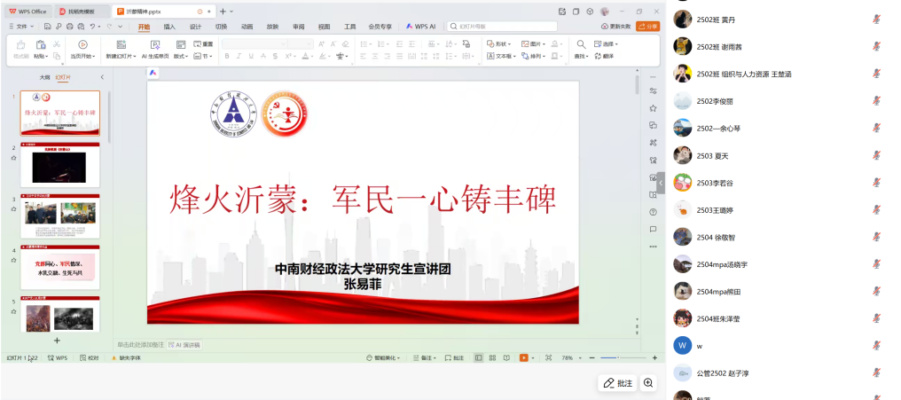紧接着,研究生党员理论宣讲团成员张易菲以“烽火沂蒙:军民一心铸丰碑”为主题进行宣讲。她别出心裁地用民族歌剧《沂蒙山》的选段引入话题,将同学们带入那段烽火岁月。随后,她以“党群同心、军民情深、水乳交融、生死与共”的沂蒙精神内涵为主线,通过渊子崖保卫战、孟良崮战役等历史事件,生动展现了沂蒙儿女坚定的理想信念;通过沂蒙红嫂明德英、沂蒙六姐妹、“沂蒙母亲”王换于等感人故事,深刻诠释了水乳交融的军民鱼水情。最后,她还结合厉家寨村从艰苦创业到发展樱桃产业、建设现代农业园的奋斗历程,展现了沂蒙精神在新时代的传承与发展,鼓励同学们传承红色基因,将沂蒙精神转化为推动社会发展的强大动力。