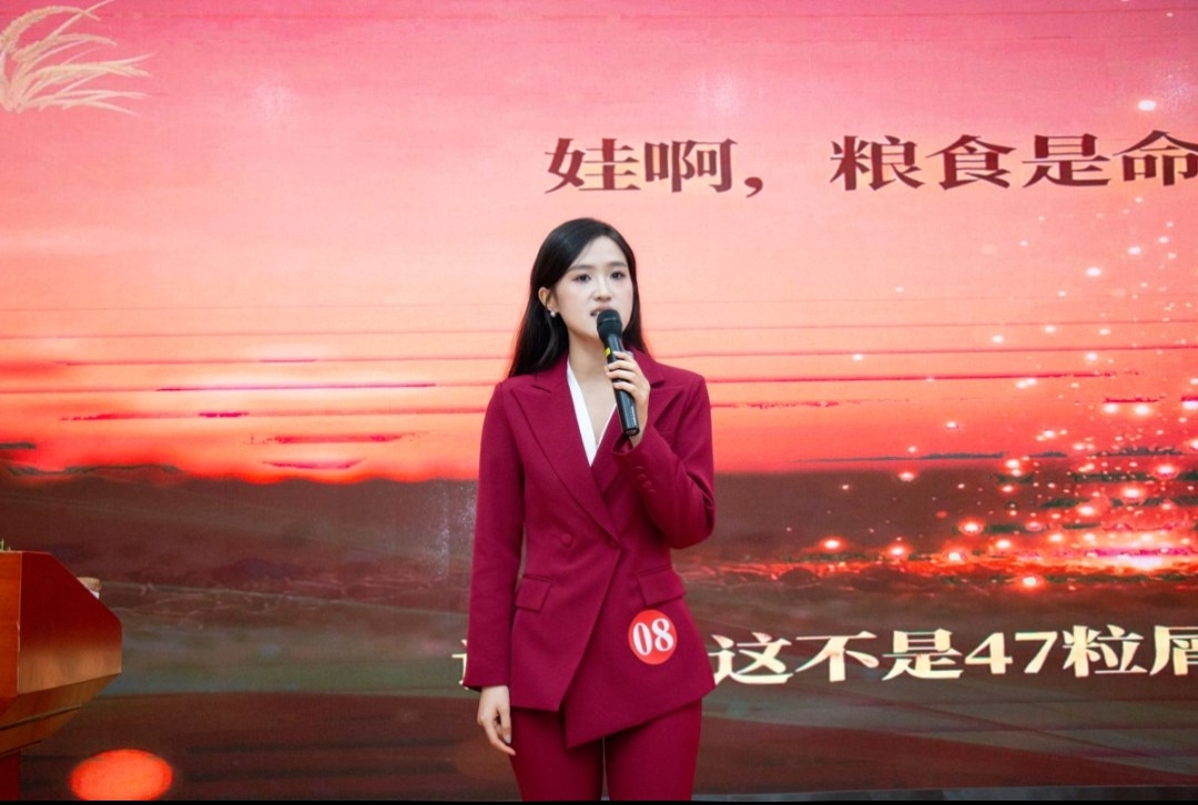 决赛现场,高煜涵同学以《麦芒中的接力,传承里的守望》为题,以“47粒馒头屑”为核心线索,串联起一段跨越时空的精神传承。她从爷爷珍惜粮食的谆谆教诲,讲到抗战时期老班长为守护干粮英勇牺牲的壮烈往事,情真意切,感人至深。她的演讲巧妙结合党的二十大报告中“全方位夯实粮食安全根基”的战略部署,以及党的二十届四中全会“十五五”规划建议里“传承红色基因”的明确要求,将个人家庭记忆升华为时代新人的责任担当,彰显了青年一代“复兴有我”的坚定信念。