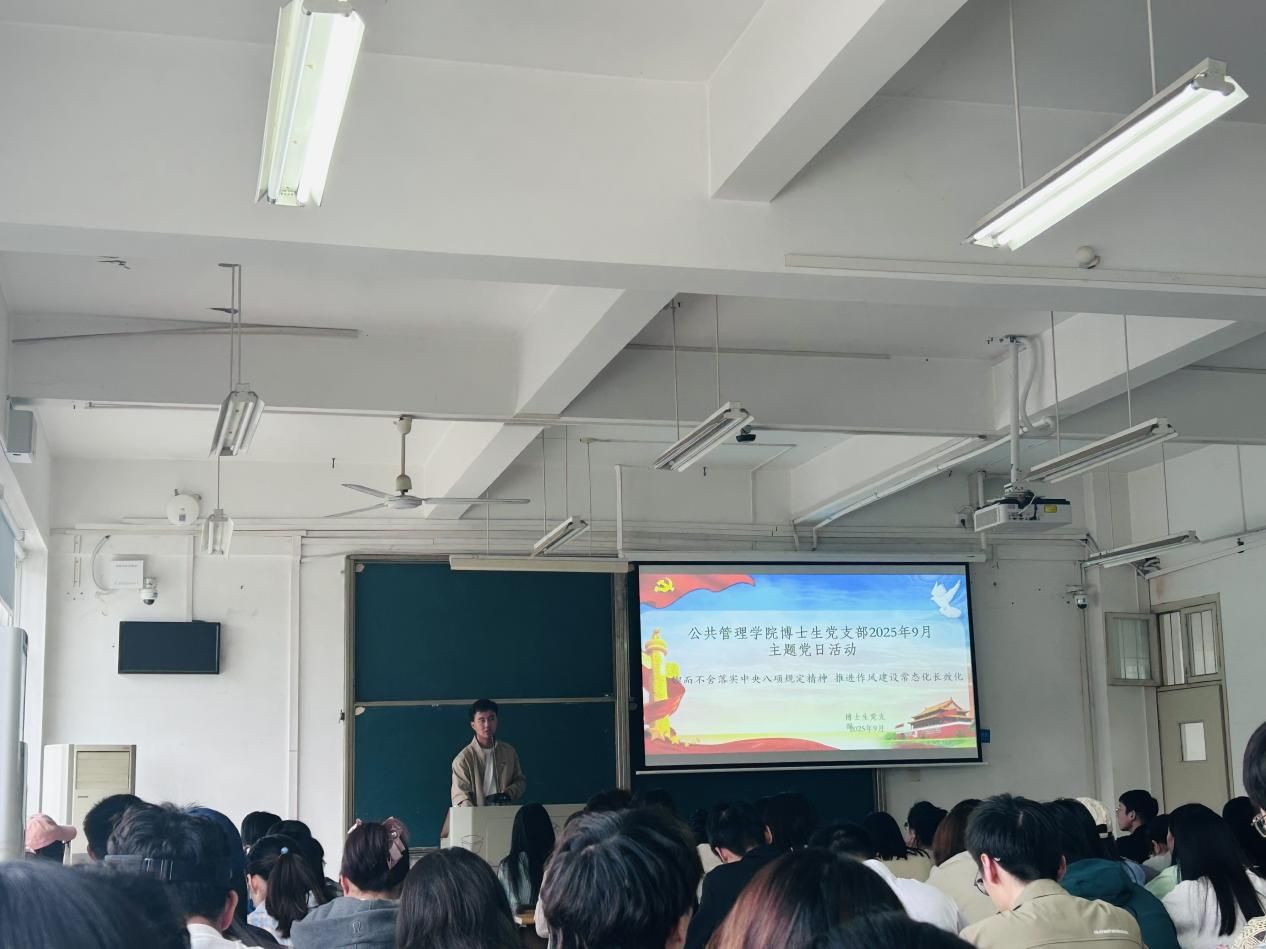 新闻网讯(通讯员 冯一桃)2025年9月25日,公共管理学院博士生党支部在文添楼205开展“锲而不舍落实中央八项规定精神 推进作风建设常态化长效化”主题党日活动,深入学习贯彻习近平总书记重要讲话和重要指示精神,学习《整治形式主义为基层减负若干规定》及换届选举相关文件。活动由博士生党支部书记李金龙同志主持,公共管理学院博士生党支部和学院全体2025级硕士生党支部党员参加。