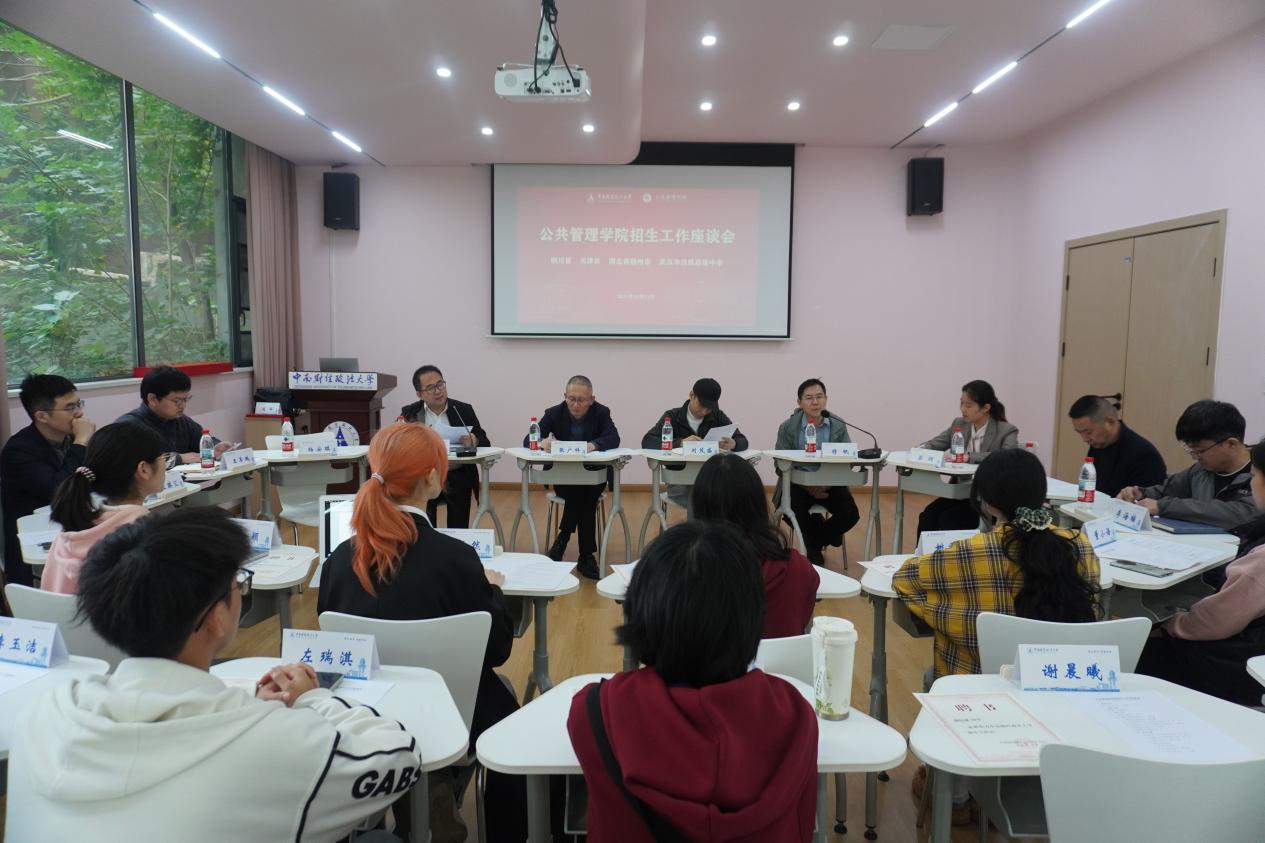 新闻网讯(学生通讯员 周颖 任怡然)为广泛收集师生对校院招生工作的宝贵意见,精准提升招生宣传实效与生源质量,10月31日下午,公共管理学院在首义校区思园一站式社区107室召开招生工作座谈会(四川省、天津市、湖北省随州市、武汉市汉铁高级中学专场)。公共管理学院院长张广科、党委副书记刘茂盛、党委委员李云新,教师代表梁辉、郭圣乾、王军鹏、王琪汇,辅导员李海楠、石玉以及18名新生代表共同参会,本次座谈会特邀本科生院招生工作办公室穆帆、杨安琪参加,会议由李云新主持。