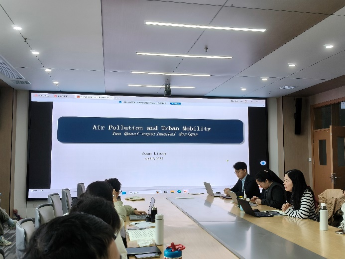 活动伊始,梁源博士从研究背景、理论框架与研究设计切入,围绕两项聚焦中国城市场景的准实验研究展开深度分享,系统解析空气污染与城市交通的双向因果关系。在第一项研究中,他创新性地将 “逆温现象” 作为衡量空气污染的工具变量,应用于城市交通领域的研究,通过严谨的实证分析,精准量化了空气污染对共享单车使用率的因果效应,为理解环境因素对居民出行选择的影响提供了全新视角。