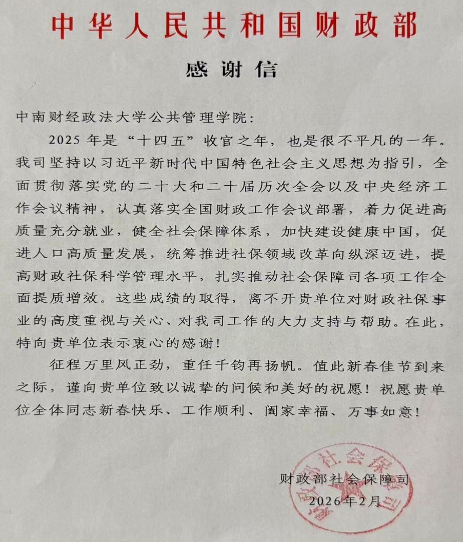 新闻网讯(通讯员:向双申)近日,财政部社会保障司向我院发来感谢信,信中就我院对财政社保事业的高度重视与关心、对社会保障司工作的大力支持与帮助表示感谢。