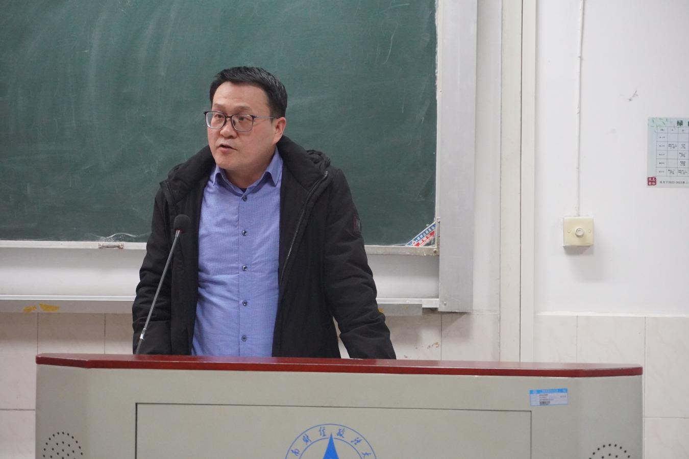 刘茂盛就学院学生工作与毕业生就业现状进行介绍。他立足社会发展现实,剖析当下时代发展中的“变与不变”,引导同学们注重培养可迁移能力与核心素养,提升综合竞争力,为未来升学、就业筑牢基础。