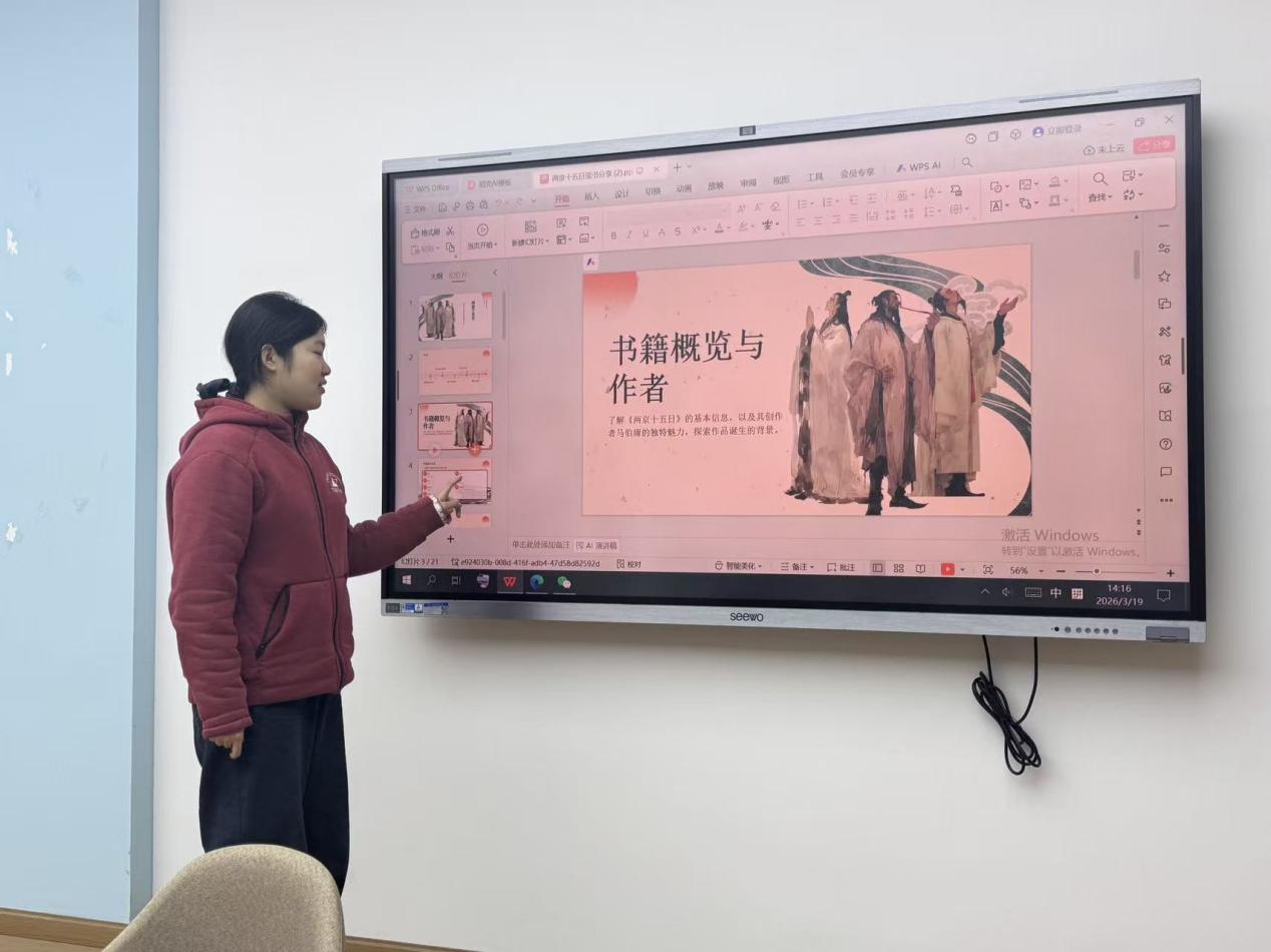 随后,田子贺分享了马伯庸的历史小说《两京十五日》。她先介绍书籍概况与作者创作特色,结合明初洪熙新政、迁都之争、漕运命脉等历史背景,讲述太子朱瞻基十五日内奔袭两千两百余里返京的惊险主线。她逐一拆解朱瞻基、吴定缘、苏荆溪、于谦四位核心人物的命运与抉择,解读作品 “以真实历史为骨架、以文学虚构为血肉” 的创作手法,带领同学们探讨皇权斗争、青年成长、家国大义与个人选择的深层内涵。