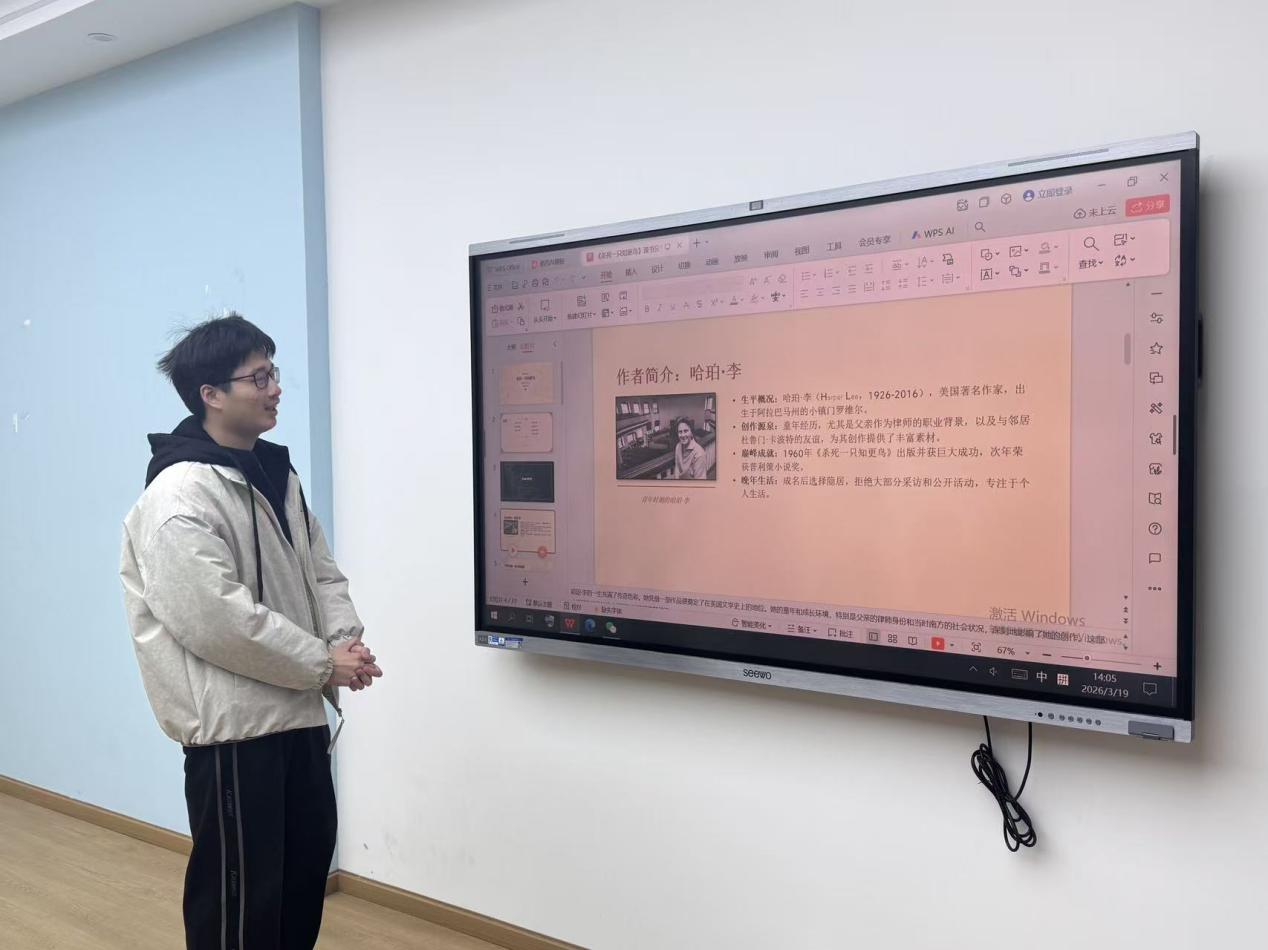 活动伊始,主持人简要介绍本次分享会的流程与意义,鼓励同学们畅所欲言、碰撞思想。张书涵带来《杀死一只知更鸟》的阅读分享,他从作者哈珀・李的生平与创作背景讲起,梳理小说成长与正义双线交织的故事脉络。他重点解读了阿迪克斯的正义坚守、斯库特与杰姆的成长蜕变,阐释 “知更鸟” 象征无辜善良者的核心意象,深入剖析反种族歧视、共情包容、勇气真谛三大主题,让大家深刻体会到良知与正义的力量。