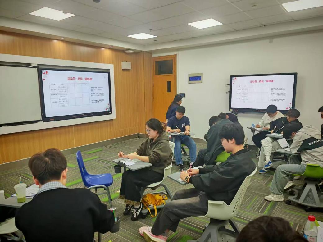 在“改写内心批评家”环节,周老师带领同学们拆解内心的负面声音,学习用友善、接纳的态度替代自我批判。通过案例分析与小组讨论,同学们掌握了“理解、接纳、不批判”的自我对话技巧,学会在学业受挫时给予自己温暖鼓励,而非苛责否定,从根源上减少焦虑的产生。