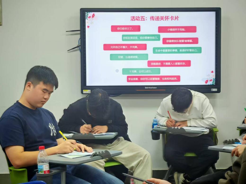 活动最后,“传递关怀卡片”环节将氛围推向高潮。同学们写下对彼此的鼓励与祝福,互相赠送温暖卡片,在双向奔赴的善意中,收获了来自同伴的支持与力量。不少同学表示,收到陌生人的鼓励时,内心充满了感动与力量,也学会了用善意对待自己和他人。