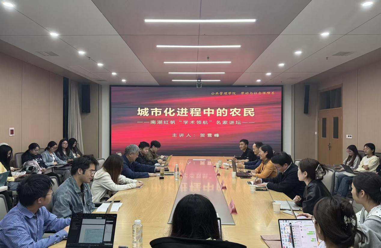 新闻网讯(学生通讯员:胡杨)2026年4月15日,劳动与社会保障系在文瀚楼东801举办“学术领航”名家讲坛学术讲座。讲座题为《城市化进程中的农民》,由武汉大学社会学院院长贺雪峰教授主讲。讲座由公共管理学院副院长薛新东教授主持,周红云教授、于长永副教授以及劳动与社会保障系部分硕士、博士研究生参与了学习交流。