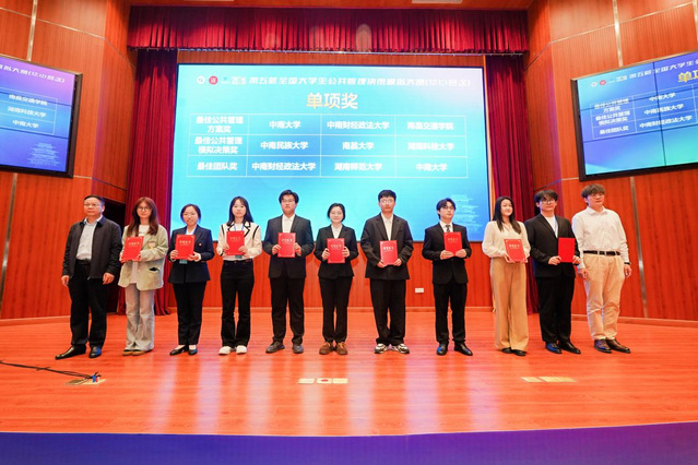 在学院的高度重视和精心组织下,我院代表队在本次比赛中表现突出。由城市经济管理系王玥、蔡大伟两位老师担任指导教师,城市管理2022级本科生韩廷毓协助备赛,劳动关系2023级本科生阳汶珊、城市管理2023级本科生羿美怡、城市管理2024级本科生李佩洲三位同学组成参赛队伍。经过方案设计、沙盘对抗、团队答辩等多个环节的激烈比拼,团队从华中赛区湖南、湖北、江西、河南四省50所高校54支参赛队伍中脱颖而出,荣获华中赛区特等奖,并同时获得最佳团队奖、最佳公共管理方案奖。王玥老师、蔡大伟老师获评优秀指导教师。