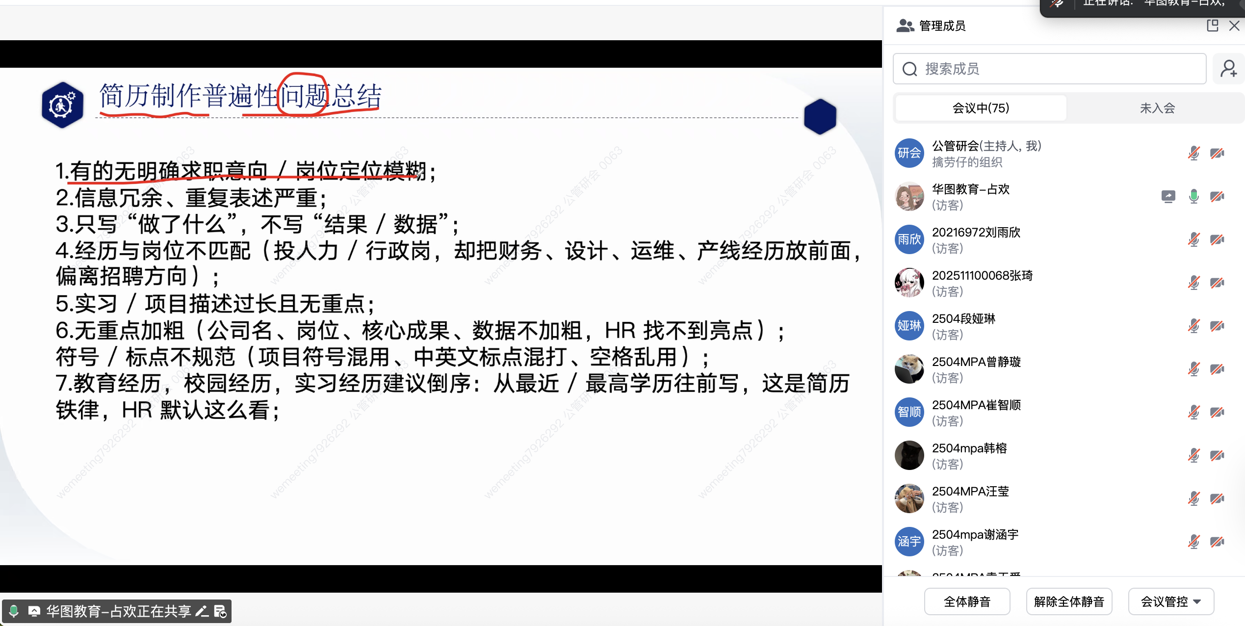 整场讲座内容紧凑、重点突出,既有理论总结,也有实践指导,使同学们对简历制作有了更加清晰、系统的认识。线上参会同学认真聆听,学习氛围浓厚。不仅帮助同学们系统掌握了简历制作的基本规范与核心技巧,也进一步增强了大家主动规划职业发展的意识。通过本次活动,同学们对如何将专业能力转化为求职优势有了更为明确的方向。